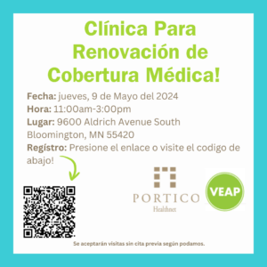 Portico Healthnet organizará una clínica de renovación para cobertura medica, en asociación con VEAP – Bloomington, el 9 de mayo del 2024, de 11:00 am – 3:00 pm. Los asistentes pueden reunirse individualmente con Navegadores Certificados de MNsure para completar los trámites de renovación de su seguro médico. Regístrate para este evento haciendo clic en el siguiente enlace: https://porticohealthnet.my.site.com/s/eventregister?regId=a65Uz0000014xNWIAY&isIframe=false